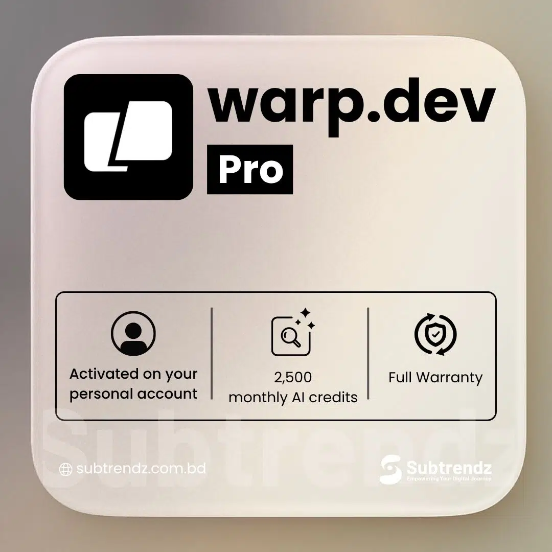 Get official Warp Build 12-month subscription at the best price in Bangladesh with instant activation and verified delivery. Built for developers and teams who demand serious AI-powered development tools, Warp Build gives you 1,500 monthly credits, access to frontier models from OpenAI, Anthropic, and Google, extended cloud agents, and unlimited collaboration — all activated directly on your personal account through Subtrendz.