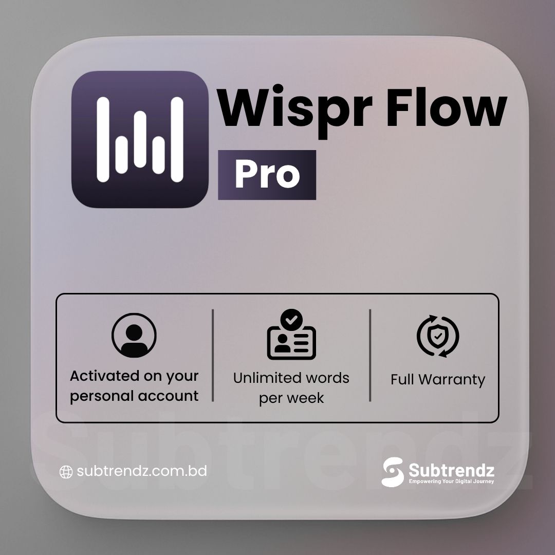 A full year of Wispr Flow Pro premium access with unlimited words per week, full cross-platform support, command mode editing, team collaboration, and prioritized support — all at the best price in Bangladesh. Official subscription. Verified service. Delivered fast. Questions before ordering? Our support team is available on WhatsApp during office hours.